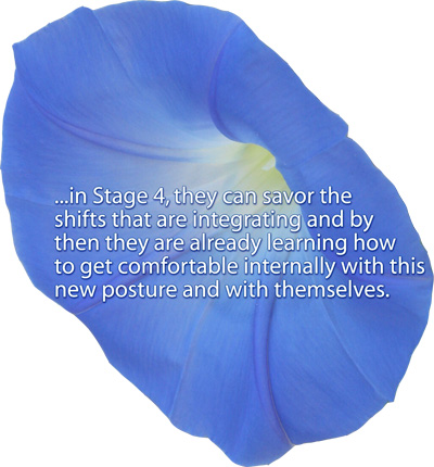 “If one moves to and through Stage 3, then the opportunity to do deep choice work begins in Stage 4. It feels like the ‘icing on the cake.’ If we’ve genuinely been with Stage 3, then in Stage 4, we can savor the shifts that are integrating while learning to feel at home with this new posture and with ourselves. We become aware of new resources within ourselves that just weren’t there before. Sometimes, depending upon the depth of the themes being addressed, when a person reaches Stage 4, the themes are completely dissolved or resolved. Often when someone rereads descriptions of the essences they’ve been receiving, they wonder how they chose them in the first place, which is a reflection of the complete transformation through which they’ve gone.”