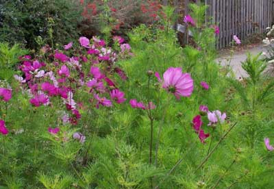 A number of magical, neopagan-oriented websites list Cosmos as one of a couple dozen flowers (including Shasta daisies, thyme, sage, lavender & rosemary) that will attract Faeries to a garden. Various writers assert that Faeries will be most at home in a “wild” (uncultivated) corner of the garden (which is also the environment where Cosmos is most at home).