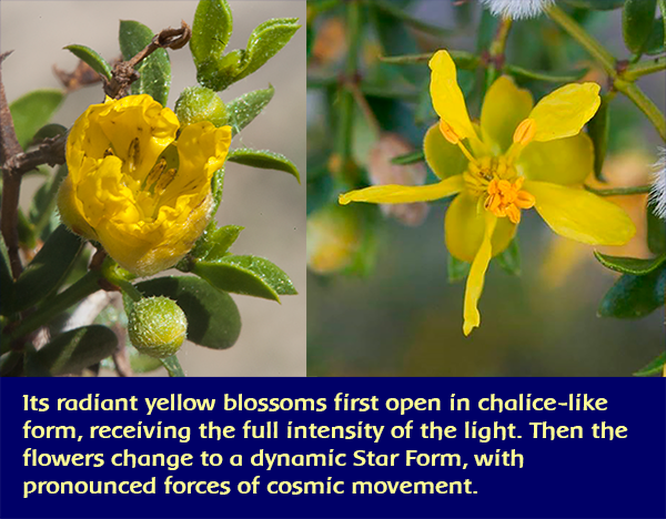 The Intriguing Gesture of the Chaparral Flower The Chaparral flower shows an especially strong alignment with the solar light element. Its radiant yellow blossoms first open in chalice-like form, receiving the full intensity of the light. Then the flowers assume a second dramatic form, as they turn perpendicular to the plane of the flower. Here we see a dynamic star gesture, a pronounced movement of cosmic forces that can be felt, even with the physical senses. This Star form is a mighty astral force, turning and whirling, working intensely into physical matter. These uniquely vivid aspects of form in the blossom, along with the capacity of the Chaparral shrub to remain resilient in severe desert conditions, and its piercing, pungent aroma, give the picture of a powerful and penetrating plant. Indeed, the Chaparral flower essence is filled with fierce solar fire, capable of bringing its purgative and purifying forces of light into the deep recesses of the soul, where darkness, chaos and entrenched trauma reside.