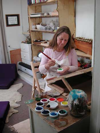 Donna's therapeutic work with painting allows each client to choose brushes and colors and express themselves freely on paper. Donna watches carefully the body language of a client during their painting experiences. She notes their breathing and other bodily gestures, such as whether they're hunched over, frowning, sighing, frustrated, hesitant, and so forth. From there she develops a "picture," an idea of where the soul is blocked and what needs to happen through the use of flower essences, counseling and other approaches to free these blockages. She provides therapeutic paints from nature and often coordinates the colors of the essence flowers with the paint. Sometimes she'll add essential oils to the therapeutic paints as well. Certain sessions involve guided art therapy—colors may be chosen that are specific to the needs of a particular client, or story-telling and images may be given that then lead the client into artistic expression.