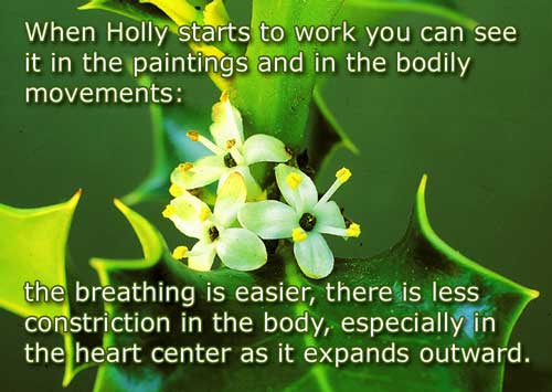 Donna gives one essence at a time to the children she works with, to be used at home. She often initially uses Mimulus with children who are fearful or shy; it helps them move forward with confidence. In general though, Mimulus seems to provide an "opening" for them to know their real concerns or issues. She then selects subsequent essences, one at a time, so that she can focus with the child on the prevailing issue. She describes it as a step-by-step process of "unlayering." Red Chestnut is another essence that works well for some of the children she works with. It is helpful for those who appear to have an obsession or compulsion to hang onto childhood; some of them seem to want to stay there. Donna is able to assure them and also explains how flower essences will be helpful in their work together. Holly is a key flower essence that Donna relies upon in early stages of therapeutic work. Holly opens the heart to expand with compassion and addresses many core issues of anger and rage. It works on emotional constriction, helping one to trust the loving impulses of others, as well as the love one has to express and share.