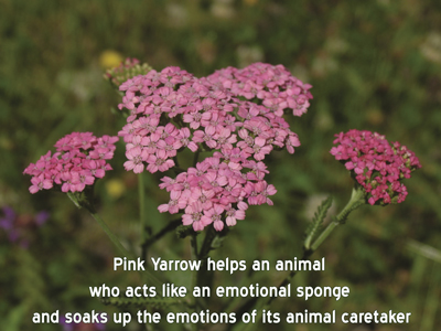 Pink Yarrow – Used for the sponge effect in animal behavior Most people familiar with flower essence therapy have encountered Pink Yarrow and understand its benefits for those with unbalanced sympathetic forces. Interestingly enough, Dr. Laura has found this same essence can be used to help animals establish boundaries with its environment, especially between the animal and its human guardian.