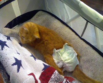 Sunny, now approximately 2½ years old, was adopted by TL as a kitten with his 6 siblings as a rescue from the street. Sunny’s health prior to his illness was excellent. When first seen, Sunny’s coat and skin were normal. He was unable to sit, stand or walk, and was barely able to hold his head up. He had just come out of a 3 ½ week coma, and was lying in a baby bed wearing diapers. At that time he was unable to interact with the other cats in his household, but seemed to be aware of their presence and that of TL (and practitioner). He made no vocalizations - and no purring. He has hissed at TL when she attempted to give him physical therapy (so that his muscles wouldn’t deteriorate from non-use). Telepathic communication indicated that he was debating whether or not to transition from the physical. He was being fed kitten milk and canned cat food thinned with water by dropper. He was sleeping 95% of the time, but was awake and somewhat alert while the practitioner was present.