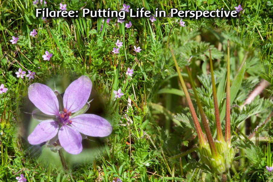 The Filaree flower is quite tiny, and you might miss the it growing throughout a grassy meadow in the spring. Lie down in the grass and take a closer look. Starting from a prostrate rosette of divided fern-like leaves, Filaree sends up a short red stem, and produces small pink-purple flowers with five fully-separated petals. In the center is a prominent red-purplish pistil, surrounded by five stamens.