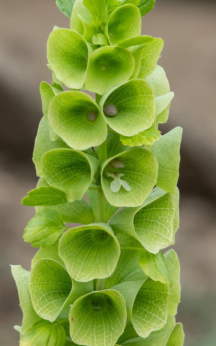 Green Bells of Ireland is a striking herbaceous plant with tall flower spikes. The blossoming plant is filled with light, with hollow square stems. The actual flowers are small, surrounded by large green calyxes shaped like receptive satellite dishes, with small thorns below each calyx. These unique “green bells” are like parabolas registering the weaving elemental forces in their environment.