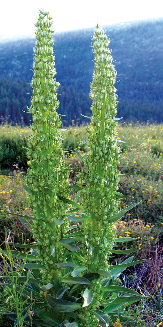 Green Cross Gentian has a gesture that soars towards the sky, like a tall column or obelisk, reaching over 2 meters in height. Stature is precisely one of its notable characteristics, climbing high into the blue alpine sky in the Sierra Nevada mountains. The leaves and flowers have a conical shape, with green flowers that face outward, strongly attached to a vertical stem. Each flower has four petals that are like compasses indicating the four directions, the four seasons, the four elements within the larger Being of Nature.