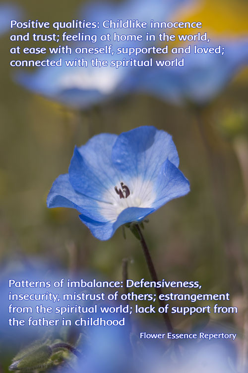 Scarlet Pimpernel – this flower essence remedy was chosen to help Baby Blue Eyes and Sunflower’s work; it facilitates the internalization of a loving father, bringing him to bear on relationship problems involving inadequate partner choices, difficulty in loving and/or shutting out people with whom she was emotionally attached.