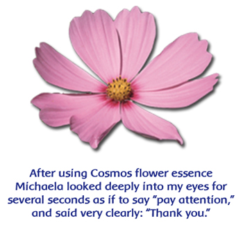 During the second scan and to begin the second phase of the sound program, Cosmos flower essence was chosen by the child’s body. I was amazed, since this flower is specifically for “speaking with clarity and depth when speech tends to be too rapid or inarticulate; integration of ideas into coherent self-expression; translating higher thoughts into mental concepts.” The day of this scan, I can remember Michaela putting her arms around my neck, looking deeply into my eyes for several seconds as if to say “pay attention,” and said very clearly: “Thank you.” For the next three months, she took Cosmos flower essence drops several times each day and just before bed. This phase in Sound Therapy addresses specifically the frequencies of speech which focus in the left brain. This location also links directly to the speech organs in the throat and mouth. Her speech blossomed weekly. Her mother and grandparents noted in their reports all of the new words she was saying, and then how she was creating expressive sentences. She began school the following year with no labels, no issues, and as a bouncy, vivacious little girl ready to show the world: “Here I am!”