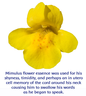 During Phase Five, an amazing thing happened during his home sessions. His mother called one day. She was somewhat frantic, saying that he was crying , really crying , while watching cartoon characters on television being hurtful to each other. Until this time, he had no negative emotions or even awareness of emotions, except being happy all the time. The flower combination of Golden Yarrow and Mimulus were chosen during the next several months. These provided an emotional buffer, especially for the solar plexus; Casey learned to project his voice out loud despite anxiety and fear of making a sound. Mimulus flower essence was used for his shyness, timidity, and perhaps an “in utero” cell memory of the cord around his neck causing him to swallow his words as he began to speak. This flower supported his nervousness when speaking. The Phase Five daily therapy of fractal sounds were specific high frequencies of consonants which resonate in the left brain speech centers.