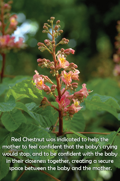 Flower essences help a mother and child to become confident and bond with each other A mother brought her baby girl to Lucas. The baby, a second child, had gastric problems, seemingly had colic, spit up milk, and also cried all the time when not sleeping. The baby would sleep only when totally exhausted. When asked about her pregnancy, the mother said it had been very tiring for her, and at one point during the pregnancy, there was a diagnosis that the baby was too small. The mother worried that the baby was ill or perhaps had a genetic disease; it was not normal. The birth occurred at the appropriate time, and there were no particular problems with the delivery. However, the situation became complicated because there were difficulties with breastfeeding and the mother developed an infection in the left breast. She wasn’t able to breast feed the baby successfully. Lucas asked the mother about the relationship with her own mother, and learned that the relationship was difficult. The baby’s grandmother was an alcoholic and when the mother was quite young, the grandmother was put in the hospital. The mother had to take care of her younger brother. When asked about having her first child, the mother said that she had felt numb. She was surprised by this state, and wondered why she didn’t feel anything emotionally.