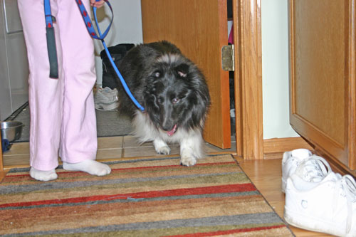 Maize continued to do well, both at home and at training. However, she still would prefer to retreat to an upstairs bedroom if given the chance. Although she tolerates the other dogs in the household well, she doesn’t play with them or initiate any activity. Maize gets overwhelmed with increased activity. She has a tendency to regress somewhat when she becomes over-stimulated or when there is a lot going on at one time (i.e., too much noise at the same time as too much activity). I would really like to see her wag her tail.