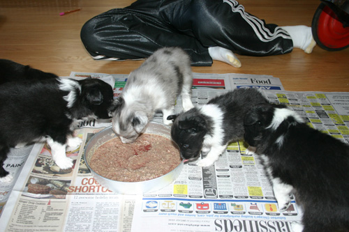 The puppies started weaning at 4 ½ weeks on December 10th. In addition to their new raw diet, I used NR Tree Bark Gruel to soothe the stomach during the weaning process. Puppy #3 became very stressed, was shaking, and became withdrawn after his first meal. I gave him