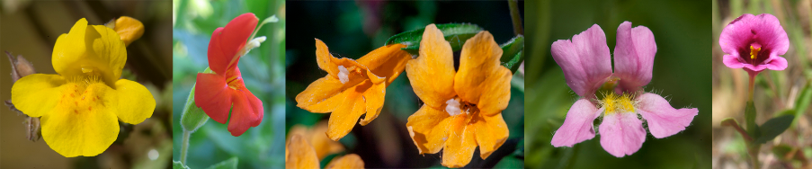Left to right: Mimulus, Scarlet Monkeyflower, Sticky Monkeyflower, Pink Monkeyflower and Purple Monkeyflower