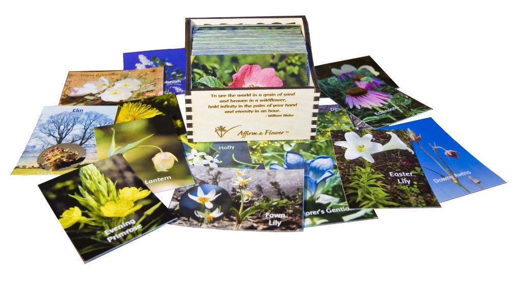 Affirm a Flower Photo Cards are available in boxed sets corresponding the the sets of FES Quintessentials, English Bach and Range of Light flower essences. There is also a full set of the card available in a wooden card holder.
