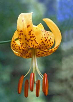 colored Tiger Lily is orange with dark spots, and has downward-pointing